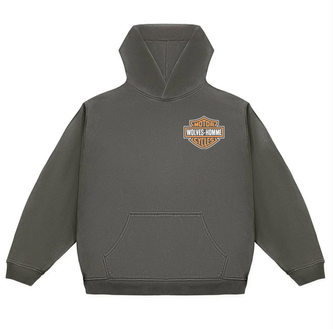 Vintage Black cotton hoodie with custom wash. Features HOMME ON WHEELS design printed on front.